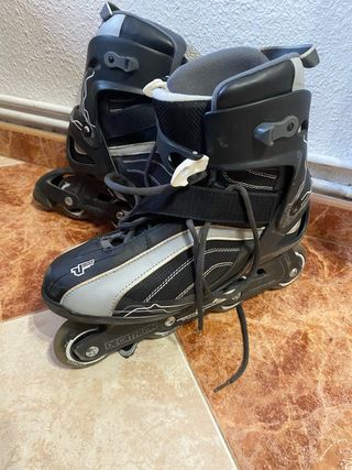 Patines en línea para niños, en buen estado. - Número 38. - Color gris y negro. - Con sistema de cierre de velcro y cordones. - Incluyen dos patines.