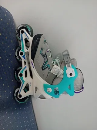 Patines en línea regulables talla 34-36. Incluye juego completo de protecciones y tornillos para poner las ruedas de atrás en paralelo.