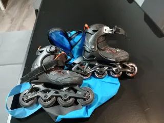 Patines en línea de color negro y gris, talla 45. - Cierre con velcro y hebilla. - Ruedas de poliuretano. - Rodamientos ABEC-7. - Bolsa transporte - Protecciones