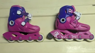 Los patines en la imagen son patines en línea con temática de Hello Kitty, diseñados principalmente para niñas. Están ajustables a varias tallas y son de color rosa y blanco.