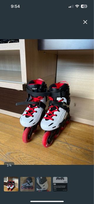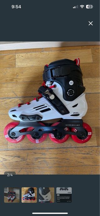 Vendo patines en línea adulto T43. Me dio la nostalgia de la niñez a mis 35 años, pero no tuve en cuenta que a esta edad el suelo está 1m más alto y que los golpes duelen más. Como para mi siempre más es mejor, me compre unos ABEC 5 para aprender, 4 veces los usé, 4 veces me dolió la cadera 1 mes y ahí se quedaron en el armario. Complemamente nuevos. Los roces que tienen son de las 4 caídas, jajaja. Un saludo.