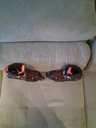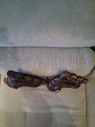 Patines en línea en buen estado, con muy poco uso. Son regulables para adaptarse al crecimiento. - Talla ajustable de la 29 a la 32. - Diseño en color negro con detalles en naranja.