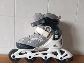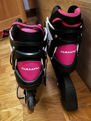 Se venden patines en línea para niña, ideales para iniciarse en el patinaje. - Diseño en color negro con detalles en blanco y rosa. - Cierre de velcro y hebilla para un ajuste seguro. - Ruedas resistentes para un deslizamiento suave.