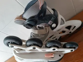 Patines en línea en excelente estado, talla 35-38 - No han tenido casi uso - Color gris y blanco. - Cierre de velcro y hebilla. - Ruedas de poliuretano impecables - Incluye protectores y funda
