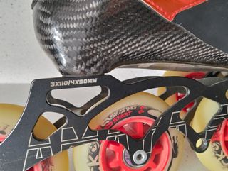 Se venden patines en línea de la marca Topicnoisy muy poco uso - Talla 44. - Diseño en color negro, blanco y rojo. - Cierre con cordones y velcro.