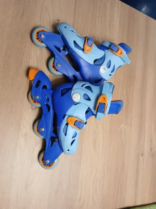 Patines en línea Oxelo ajustables para tallas 32 a 34. Perfectos para iniciarse en el patinaje. Cierre de velcro y hebilla para un ajuste seguro. Se han utilizado mucho, y tienen varios roces, pero las ruedas fueron cambiadas hace 3 meses y están en buen estado.