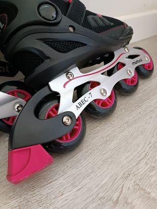 Patines en línea, en muy buen estado. - Marca: Mistral - Modelo: con ruedas ABEC-7 - Color: negro y rosa - Talla: 37 Protectores Oxelo talla S