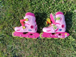 Patines en línea de color menta y rosa de Decathlon. junto a los patines incluyo set para poner las ruedas traseras en paralelo y así facilitar el aprendizaje. - Talla ajustable 28-30. - Cierre con velcro y hebilla. - Ruedas de color rosa.