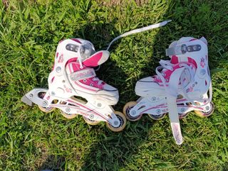 Patines en línea para niña, en buen estado. Ideales para principiantes. - Color: Rosa y negro. - Incluyen bolsa de transporte.