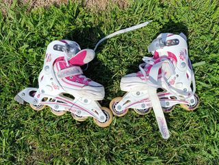 Se venden patines en línea ajustables, perfectos para los más pequeños. - Diseño blanco y azul. - Cierre de velcro y hebilla. - Ruedas de color azul.