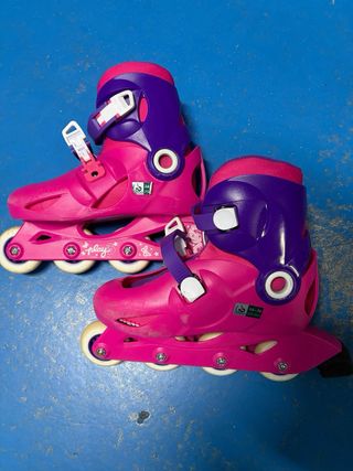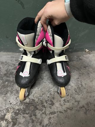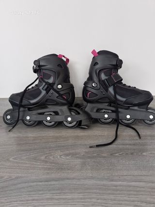 Patines en línea ajustables. - Talla ajustable de la 32 a la 35. - Diseño deportivo en negro y rosa. - Cierre de velcro y hebilla.