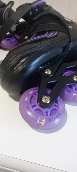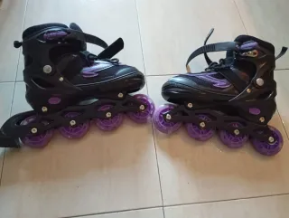 Patines en línea ajustables para tallas 35 a 37. Diseñados para ofrecer comodidad y estilo. - El fabricante lo da como talla M - Color negro con detalles morados. - Ruedas moradas que lucen al rodar,están en perfectas condiciones. - Apenas usados, estan un poco arañados, pero Apenas se nota. -En perfecto uso, cacetin interior como nuevo.