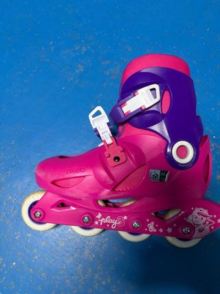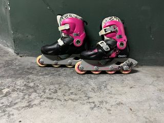 Patines en línea infantiles de la marca Oxelo, ideales para iniciarse en el patinaje. - Diseño en color rosa y negro. - Cierre con velcro y hebilla. - Ruedas de color rosa y gris.