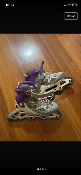Se venden patines en línea tallas 32 a 35. Incluyo protección (coderas, rodilleras y muñequeras) y bolsa de transporte. - Color principal gris con detalles morados. - Cordones de ajuste en color rosa. - Cierre de velcro y hebilla para mayor seguridad.