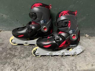 Patines en línea de la marca Oxelo, diseñados para patinaje recreativo. - Color negro con detalles en rojo y blanco. - Cierre con velcro y cordones. - Ruedas de poliuretano.