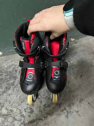 Patines de línea Oxelo en buen estado, talla 36-38. Son de color negro con detalles en rojo y blanco. -Marca: Oxelo - Sistema de cierre con hebilla y correas. - Ruedas y freno en buen estado.