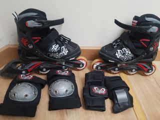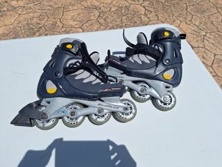 vendo patines extensibles del número 25 al 28,de línea,poco uso,lleva dos ruedas detrás para principiantes con opción de ponerla en medio haciendo llínea cuando ya sepan manejarse con soltura.