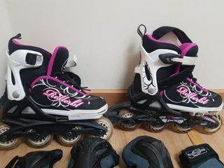 Patines en línea rosas regulables desde la talla 34 a la talla 37. Se incluye también rodilleras, coderas y guantes. Está todo muy bien cuidado