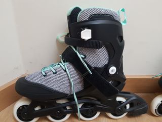 Patines en linea de la marca Oxelo talla 40 , tipo fitness, prácticamente nuevos. Ruedas de 80 mm, guia de aluminio con rodamientos ABEC 7.