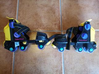 Patines en línea Fisher Price para niños pequeños. Están en buen estado, aunque muestran señales normales de uso. El tamaño se ajusta al pie - Marca: Fisher Price - Color: Azul y amarillo - Ideales para principiantes