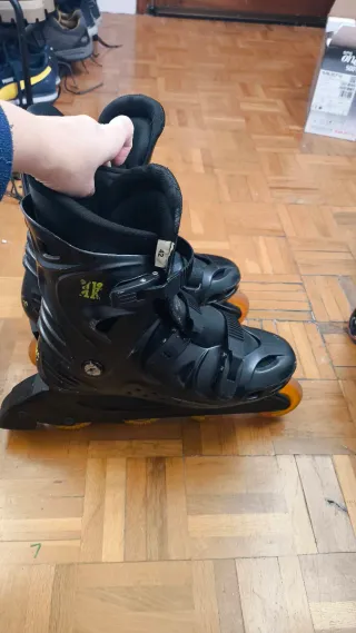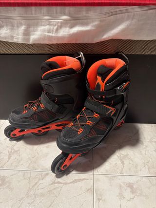 Patines en línea de color negro y naranja, talla 43. - Cierre de velcro y cordones. - Ruedas de poliuretano. - Botín acolchado. muy poco uso praticamente nuevos.