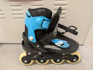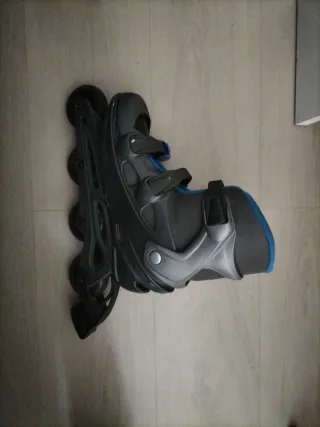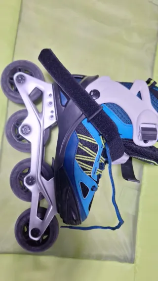 Se venden patines en línea en color azul y negro. - Talla 40-41. - Cierre de velcro y hebillas. - Ruedas de poliuretano.