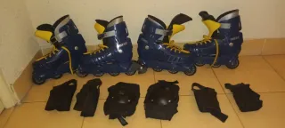 Se venden dos pares de patines en línea, ideales para quienes disfrutan del patinaje. - Patines de color azul con detalles en amarillo. - Incluye protecciones para rodillas y codos.