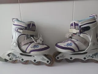 Se venden patines en línea K2 en color morado y blanco. Son cómodos y perfectos para iniciarse. - Cierre de velcro y hebilla. - Ruedas de 76mm. - Rodamientos ABEC 3. - Diseño con detalles florales en el patín. Regalo protecciones