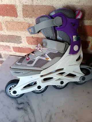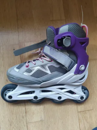 Se venden patines en línea con un diseño moderno en colores morado y gris. - Cierre de velcro y cordones para un ajuste seguro. - Ruedas resistentes para deslizarse con facilidad. - Botas cómodas y acolchadas. _Muy poco uso son del número 32