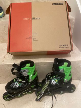 Patines en línea Roces de color negro y verde, ideales para iniciarse en el patinaje. - Talla ajustable de 26 a 29. - Cierre de velcro y hebilla. - Ruedas de 70mm. - Rodamientos ABEC 5. - Incluye instrucciones de seguridad.