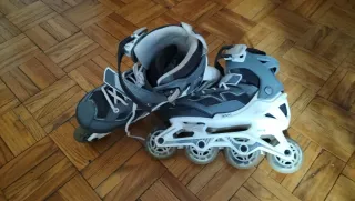 Patines en línea de color gris y negro, talla 43. Incluyen protecciones.
