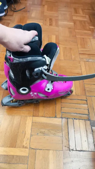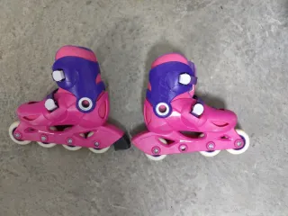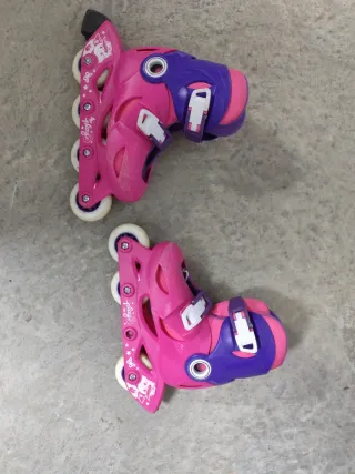 Se venden patines en línea de la marca Oxelo, en color rosa y morado. Perfectos para iniciarse en el patinaje. Talla 28-30. Se adapta a cualquiera de esas tallas. Pueden usarse según crece el pie - Diseño infantil con detalles de mariposas y unicornios. - Cierre de velcro y hebilla para un ajuste seguro. - Ruedas de 70mm.