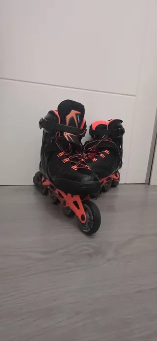 Patines en línea con un diseño moderno en negro y detalles naranjas. - Cierre de cordones y velcro. - Ruedas de poliuretano. - Estructura resistente. Talla 35-38 venta en Valladolid entrega en mano