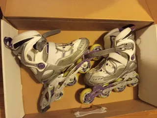 Patines en línea de la marca Roces, modelo Slim 250 W, ideales para patinaje recreativo. Cierre con cordones, correas de velcro y automático. Con piezas para el recambio. Costaron más de 70 €. Se entrega con funda de transporte. Con roces de uso pero realmente apenas se ha usado (ni sabía patinar ni aprendí 😅). Se entregan también juego protecciones completo pero no puedo poner más fotos