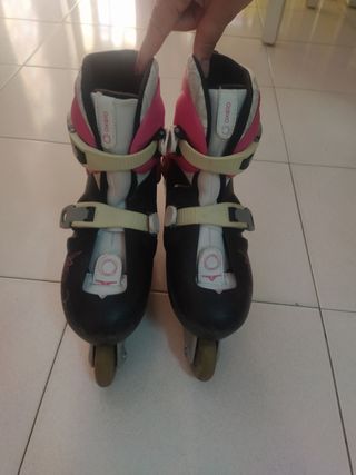 Patines en línea de color negro, marca Oxelo. - Ruedas de 80 mm. - Rodamientos ABEC 3. - Cierre de hebilla y velcro. - Talla 32-35. 20-22 ver fotos se pueden estirar - no están rozados, es sucio, no los ha utilizado más que tres veces