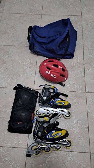 Vendo patines en línea Oxelo talla 30-32, en muy buen estado, un casco azul claro y protecciones. - Incluye un par de patines, casco, protecciones (en bolsa) y maleta para transportarlo todo. - Los patines son de color gris y amarillo. - El casco es de color azul claro. - Las protecciones talla XS para niños entre 6 y 10 años. color azul. - Bolsa de transporte negra con detalles amarillo fluorescente. Mayor desgaste en rodilleras y las puntas de los patines.
