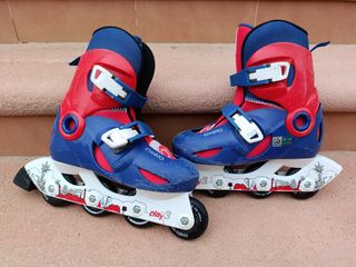 Patines en línea infantiles con diseño de Avengers. Están en buen estado, aunque presentan algunas señales de uso. - Número de ruedas: 4 por patín. - Diseño: Avengers. - Color: Azul y blanco. - Talla: consultar medidas.de 35 asta 37