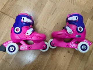 Se venden patines en línea de color rosa, ideales para iniciarse en el patinaje. - Talla ajustable para adaptarse al crecimiento. desde 32 a 34 - Diseño con detalles infantiles. - Ruedas de poliuretano.