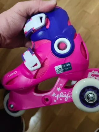 Patines infantiles de la marca Oxelo, ideales para iniciarse en el patinaje. - Color rosa y azul. - Cierre con hebilla. - Ruedas blancas con detalles. - Talla ajustable 26-28. - Tornillería para poder poner las ruedas en línea