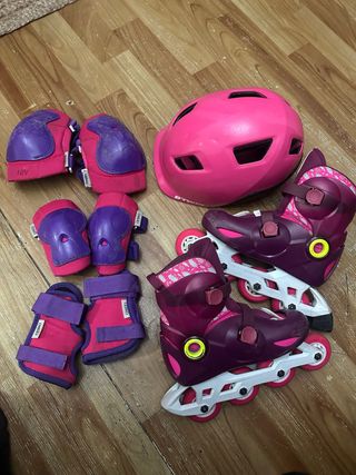 Conjunto de patines y equipo de protección para niños. - Patines Oxelo ajustables en color gris y morado. Numero 32-35 - Casco Oxelo rosa. 52-54cm - Muñequeras, rodilleras y coderas Oxelo incluidas en bolsa de malla. Hasta 10 años aproximadamente. - Bolsa de transporte rosa con detalles verdes.