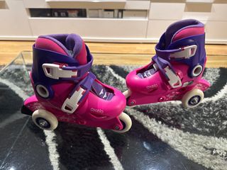 Patines infantiles de la marca Oxelo, ideales para iniciarse en el patinaje. Son ajustables para adaptarse al crecimiento. Sirve de la talla 26 a la 28. No negociable. - Color rosa y morado. - Cierre de velcro y hebilla. - Ruedas blancas.