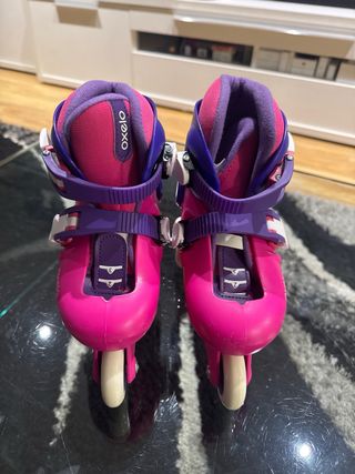 Patines infantiles de la marca Oxelo en color rosa y azul. - Talla 26-28. - Cierre de velcro y hebilla. - Ruedas de patinaje en línea. Las traseras se pueden cambiar de posicion.