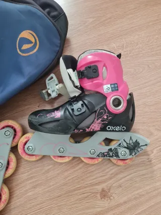 Set de patines infantiles de la marca Oxelo, ideales para iniciarse en el patinaje. - Color rosa y negro. - Diseño deportivo. - Incluye bolsa de transporte azul.
