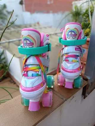 Patines de niña con un divertido diseño de unicornios y arcoíris. Perfectos para iniciarse en el patinaje. - Diseño con unicornios y estrellas. - Cordones con estampado de arcoíris. - Ruedas de colores. - Cierre de velcro y hebilla. - Tienen poco uso