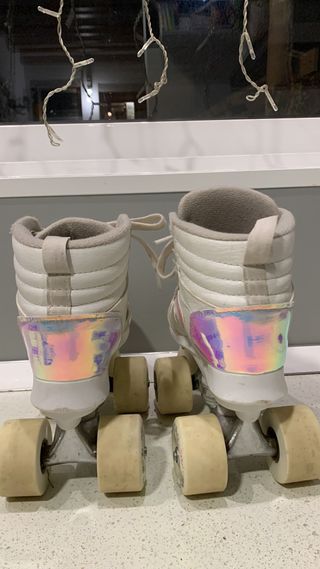 Patines infantiles de cuatro ruedas en color blanco con detalles iridiscentes. - Diseño de bota alta. - Cierre con cordones. - Detalles holográficos en los laterales y talón. - Ruedas de color crema.