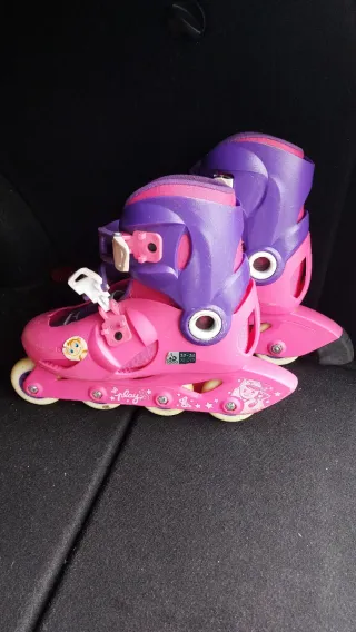 Patines en línea de color rosa, talla 34-36. - Diseño con personajes infantiles. - Cierre de velcro y hebilla. - Ruedas de patinaje.