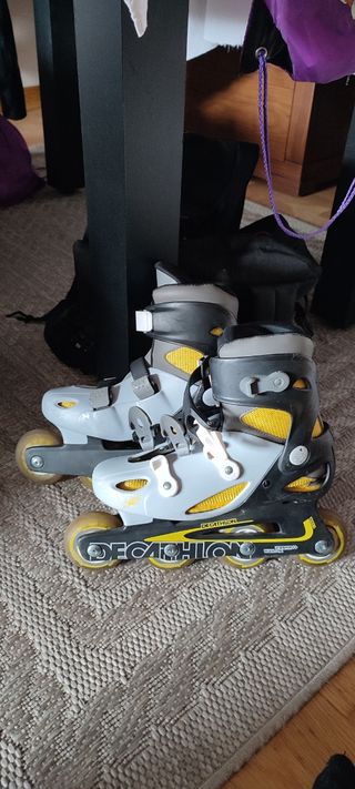 Patines en línea para niños, talla ajustable 28-30 de decathlon. Están en buen estado, con alguna marca de roce por uso. Usados en contadas ocasiones, se puede ver el estado de las ruedas. Incluye un kit de estabilidad para cambiar de 4 en línea a 2 ruedas laterales, como los ruedines de una bici.