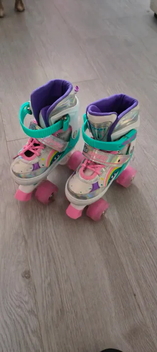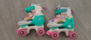 Patines infantiles de cuatro ruedas con un diseño colorido y divertido. Ajustables al crecimiento del pie. Usados pero en buen estado. - Cierre de velcro y cordones. - Ruedas de color rosa. - Detalle de arcoíris y flores.