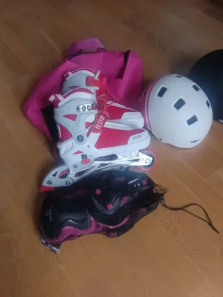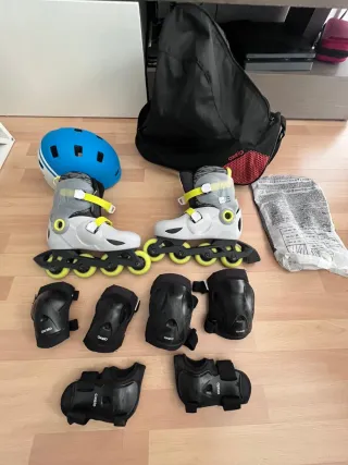 Set completo de patines para niños, talla de la 32 a la 34, se ajustan a la medida necesaria, ideal para iniciarse en el patinaje de forma segura. Incluye todo lo necesario para protegerse. Usado un par de veces. - Patines ajustables en color blanco, gris y amarillo. - Juego de protecciones: rodilleras, coderas y muñequeras. - Casco de protección azul. - Bolsa de transporte negra.