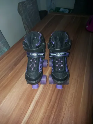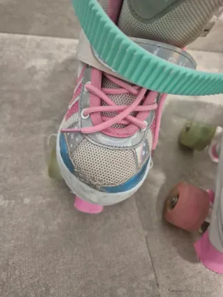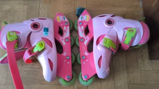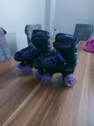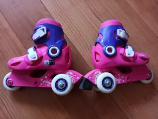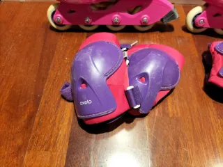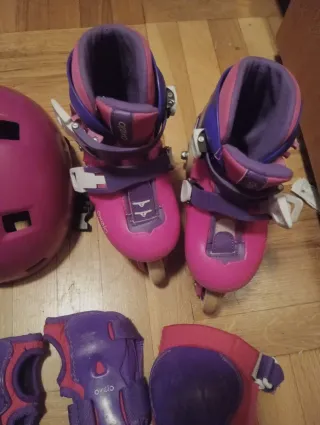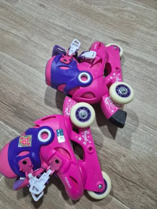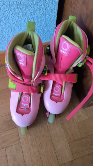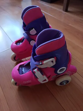 Patines infantiles ajustables en color rosa y morado. Están usados pero aun pueden valer para un tiempo. Ideal si la niña o niño quiere probar si le gusta el patinaje, en lugar de gastar en unos nuevos. - Talla ajustable de 32 a 34. - Cierre de velcro y hebilla. - Ruedas con diseño. - Marca Oxelo.